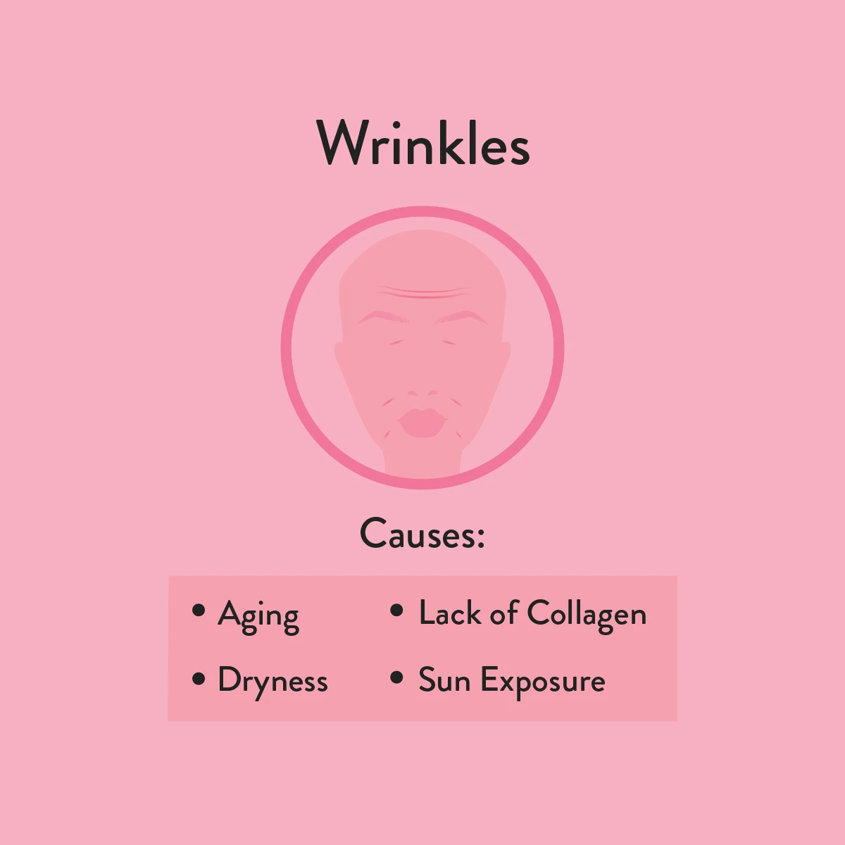 A wrinkle is any furrow on the skin surface. It is caused by progressive collagen loss, resulting in low tissue elasticity and cellular reproduction. Wrinkling occurs naturally in the aging process but can be exacerbated by smoking, sun exposure, drinking or poor nutrition or water intake.