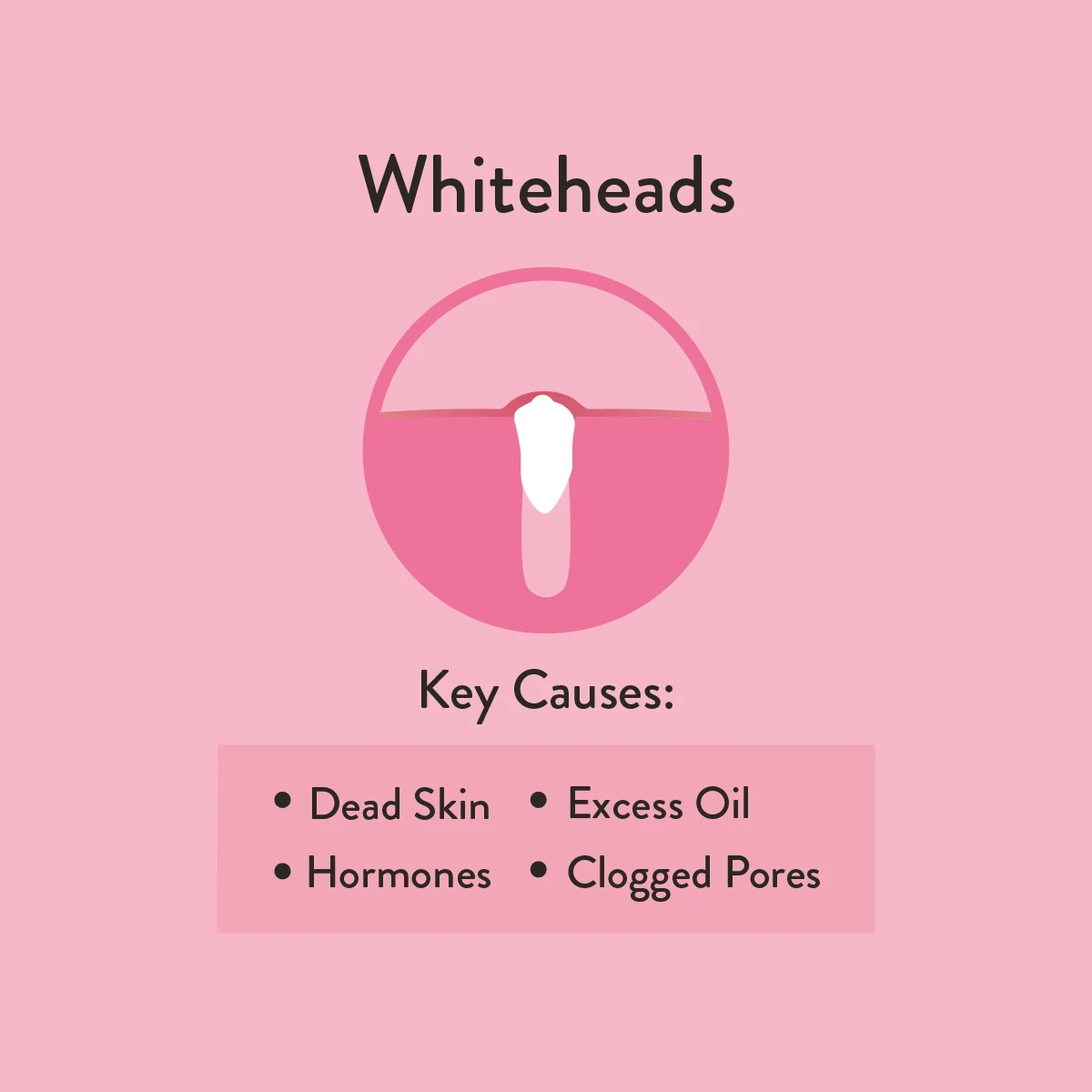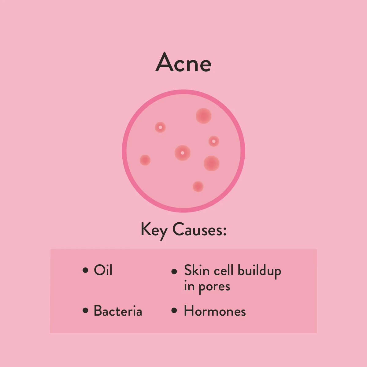A skin condition caused by clogged pores, excess oil production and bacteria. When pores become clogged with oil and dead skin cells, they are the perfect environment for bacteria growth. This causes whiteheads, blackheads and potentially leads to inflammation in the form of red, raised bumps.