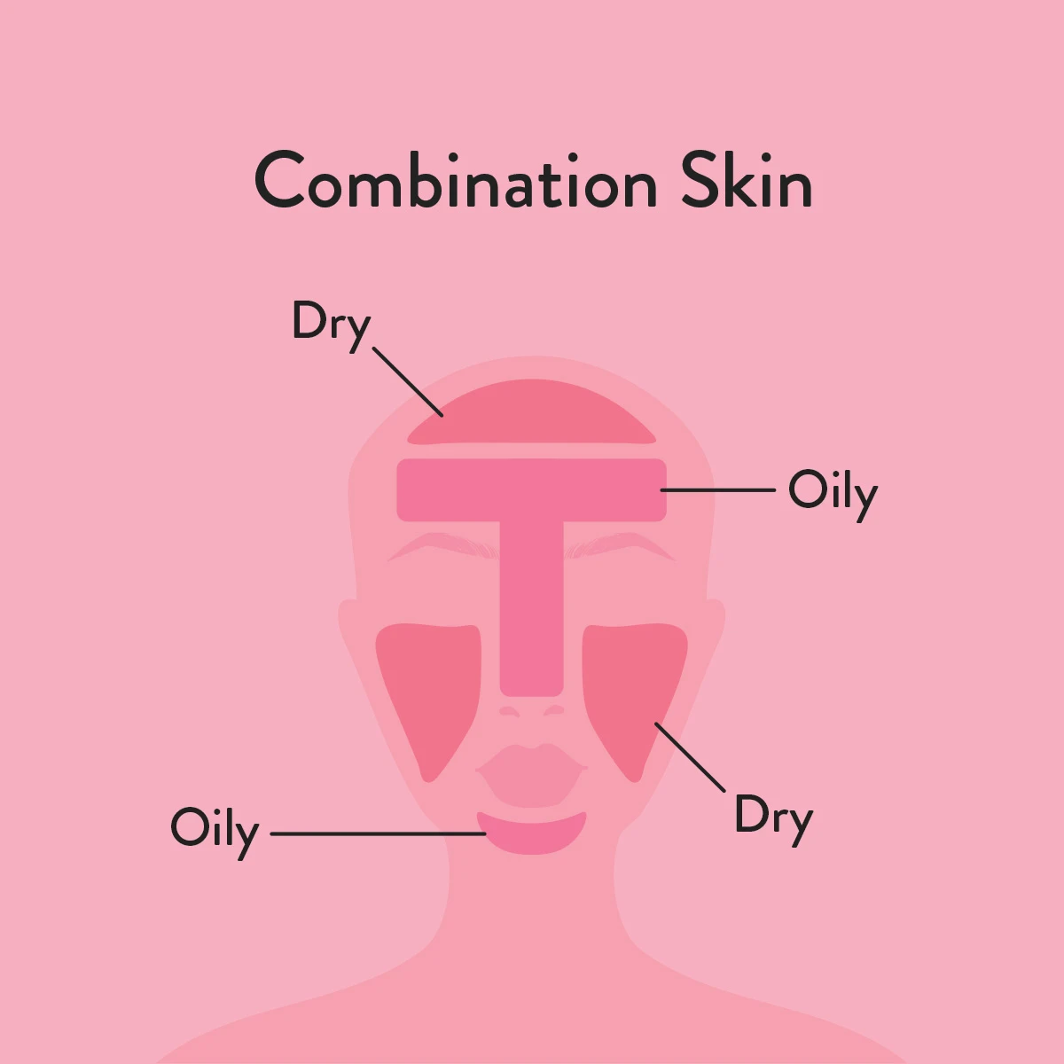 Skin that is dry or normal in some areas and oily in others. This skin type tends to have more active oil glands in the T-zone (forehead, nose, and chin), making it prone to clogged pores. The cheeks have fewer active oil glands, so they may appear dry and flaky.