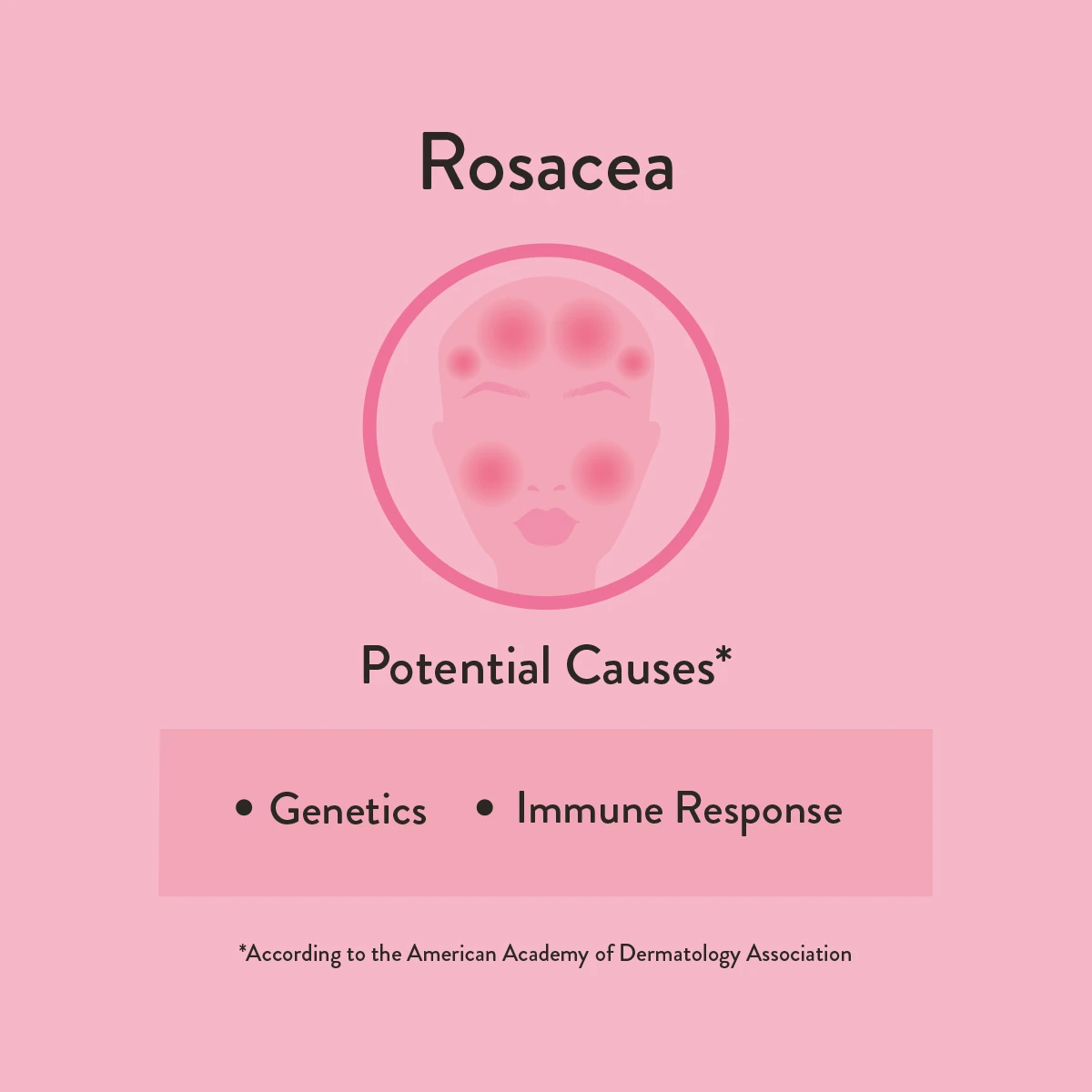This chronic condition is characterised by inflamed, small blood vessels, persistent flushing, redness, hyper-reactive skin, and sometimes even pus-filled lesions. It’s often hereditary, though the exact causes are not known. It is treated by finding and managing triggers, wearing sun protection, and using rosacea-friendly skin care products.